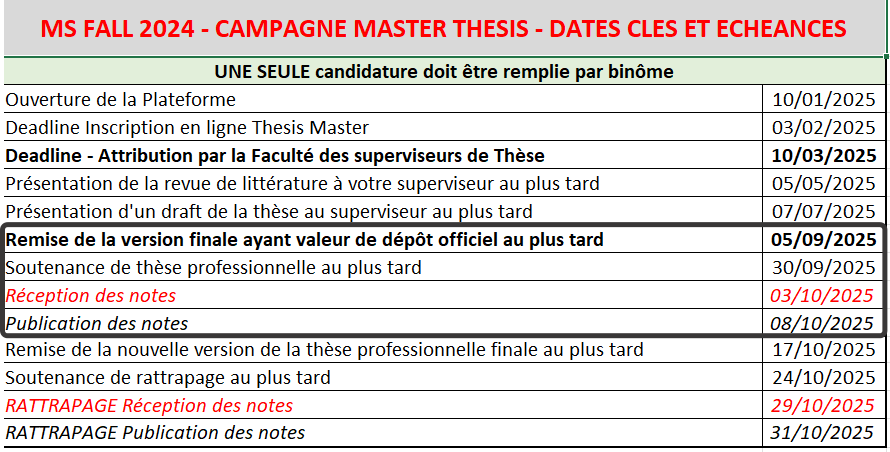 Sur l’exemple de la promo 2024-2025, les dates finales (septembre-octobre) avoisinent toujours les mêmes tranches calendaires: